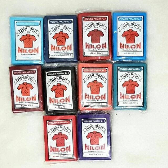 Ready semua warna (30 warna) Pewarna pakaian / Tekstil merk "Nilon"Digunakan untuk menguatkan warna pakaian yg sudah pudar, tdk untuk.mengganti warna pakaianCara penggunaan mudah1 bungkus cukup untuk 300 gram kainTidak disarankan untuk kain berbahan karetPastikan kain yang akan diwarnai berbahan tebal dan tahan panas untuk menghindari kerusakan pada kainAkan ada sedikit lunturan warna saat pencucian pertama. Luntur ini biasanya terjadi karena proses pembilasan yg kurang bersih.Cara pakai : Siapkan 2 liter air tambahkan 2 sendok teh garam dapur lalu masukkan bubuk pewarna. Panaskan hingga air mendidih sambil diaduk. Kain dicuci bersih dan diperas lalu dimasukkan ke dalam larutan pewarna hingga terbenam seluruhnya sambil dibalik balik supaya warnanya merata selama pengadukan air dijaga hingga hampir mendidih. Setelah 1 jam kain diangkat dan dibiarkan menjadi dingin terlebih dahulu. Cuci dengan air dingin beberapa kali hingga sisa pewarna benar benar bersih. Berikan catatan warna saat order, contoh warna di gambar 2Terima kasih...stock rea